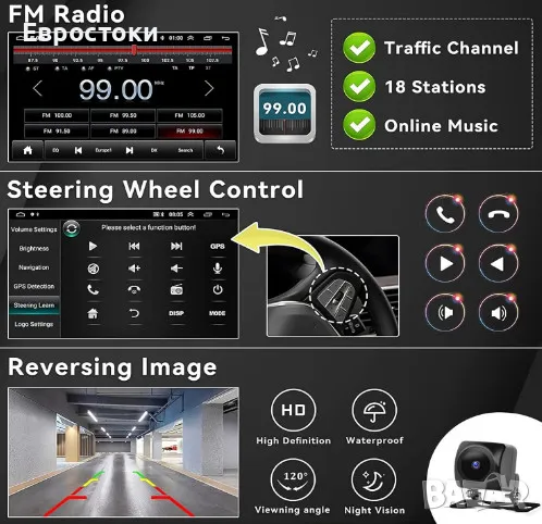 Автомобилно радио с камера за заден ход и управление от волана. Включена е външна камера за заден ход. При движение на заден ход дисплеят автоматично превключва на видео интерфейс за заден ход. Оригиналното управление от волана е съвместимо и може да се използва за обучение на желаните функции, като: увеличаване/намаляване на звука, отговаряне на повиквания, смяна на номера и др.