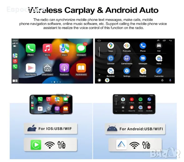 Безжичен Carplay и Android Auto. Мултимедия за кола CAMECHO поддържа оригинален USB кабел за данни и WiFi връзка. Имате достъп до информация като телефонни контакти, имейли, известия, навигация по карти, музика и видеоклипове и можете да извършвате гласов контрол.