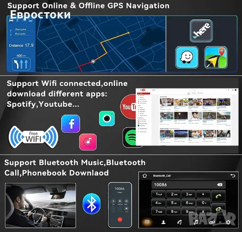 Радио за кола с GPS навигатор и WIFI. Вграденият GPS приемник поддържа както онлайн, така и офлайн, което ви позволява да навигирате лесно. Радиото за кола лесно се свързва с WiFi или hotspot, след което можете да сърфирате в интернет и да използвате всякакви приложения, като GPS карти, YouTube, TikTok, Spotify и др.