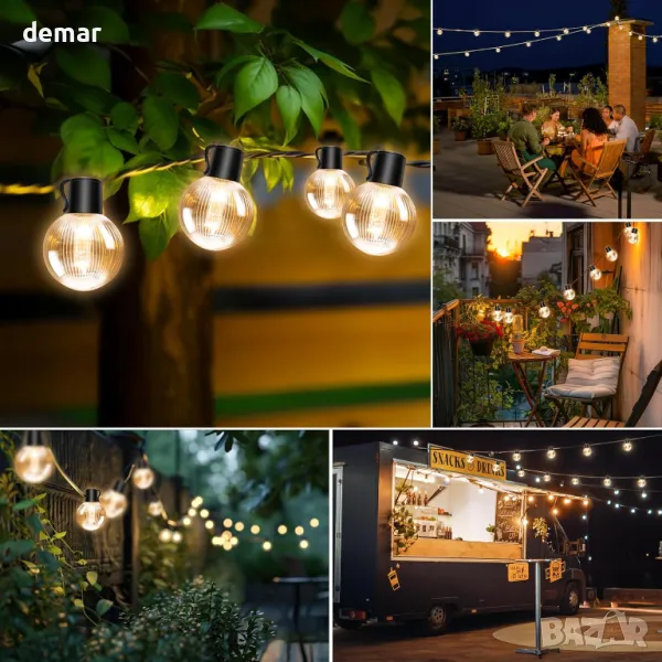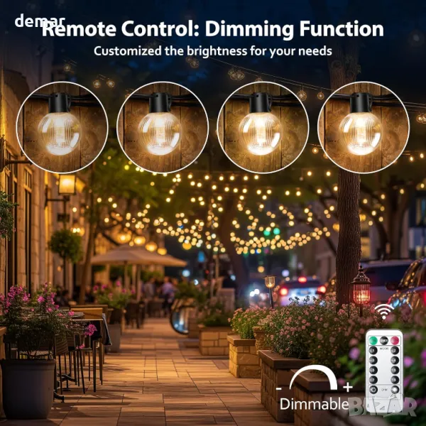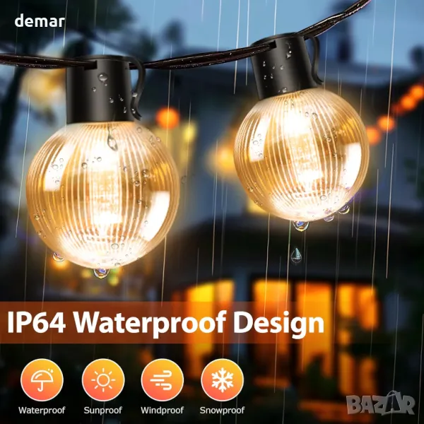 Тези захранвани с батерии външни фестонни светлини разполагат с големи G60 LED кълбовидни крушки, осигуряващи топло бяло осветление за създаване на уютна атмосфера за различни поводи. Оборудвани с дистанционно управление, светлините предлагат димиране от 0% до 100% и 8 режима на светене, плюс функция за таймер (6 часа включено, 18 часа изключено). Проектирани за издръжливост, те са водоустойчиви IP64 и могат да издържат на тежки атмосферни условия. Енергоефективните LED крушки с ниско напрежение консумират само 0,08 W на крушка, спестявайки над 90% електроенергия в сравнение с опциите с нажежаема жичка. Перфектен за вътрешни и външни настройки като градини, партита, сватби и др. Забележка: Необходими са 3 AA батерии, които не са включени в пакета.