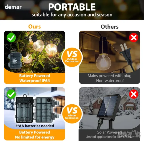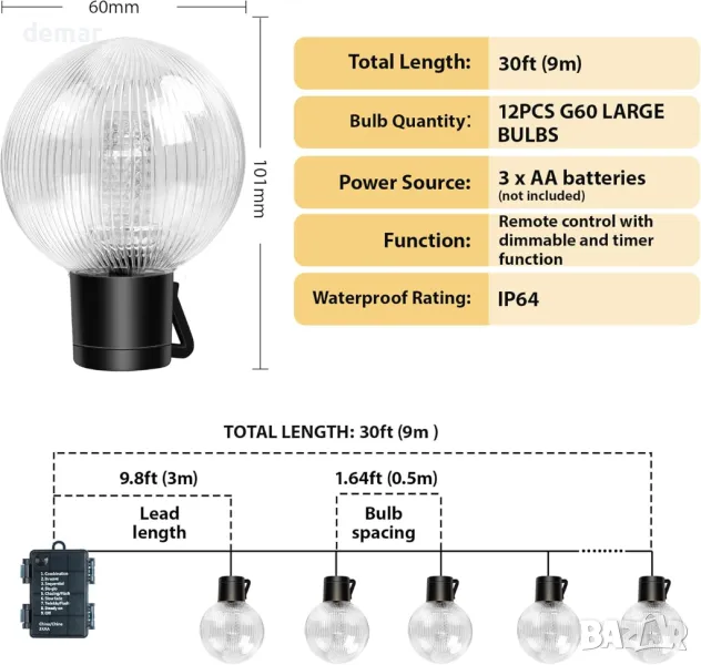 DSLebeen 9 м Водоустойчиви феерични светлини,захранвани с батерии,12 бр G60 LED крушки,дистанционно