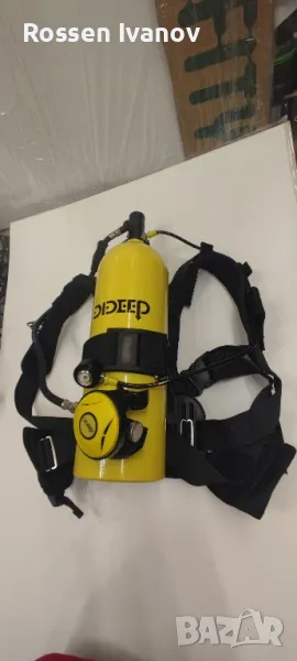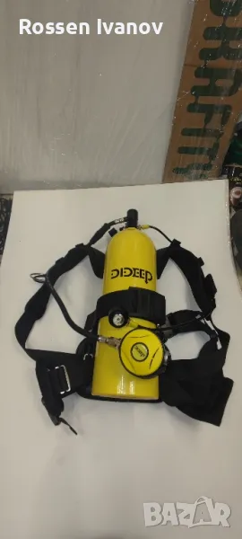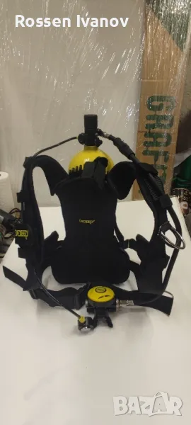 Комплект за гмуркане с 4литрова бутилка. Общо тегло около 6,5кг. Пълни се с компресор или с по-голяма бутилка. Максимално налягане 200bar. Издържа между 40-60ми. В зависимост от индивидуалната подготовка и физиология на човека, както и от дълбочината. Има манометър който показва в реално време колко въздух остава. В комплекта има и очила за гмуркане.