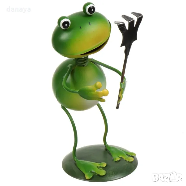 Мини градинска декорация – метална жаба с инструмент, 15 см