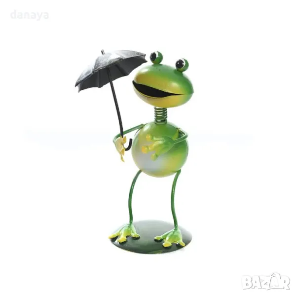 Добавете забавен и стилен акцент към вашата градина, балкон или беседка с тази метална декоративна жаба! Висока приблизително 15 см, тя е изцяло изработена от метал и оцветена в свеж зелен цвят и жълта окраска.