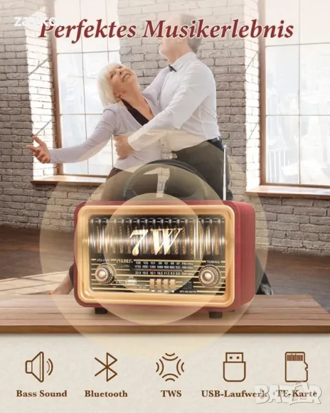 Силен стерео звук и TWS сдвояване: Това ретро радио е оборудвано с мощен високоговорител от 7 вата, така че можете да очаквате силен и кристално чист звук с мощен бас. Свържете безжично 2 високоговорителя заедно, за да създадете 360° цялостно съраунд стерео звуково изживяване и да превърнете всяка стая в динамична парти среда. Потопете се в прекрасния музикален свят и всички грижи ще загърбят.