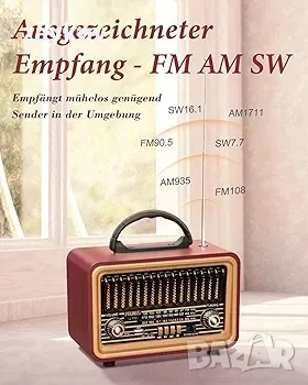 Световно радиоприемник с отлично приемане: не само ретро Bluetooth високоговорител, но и преносимо SW/AM/FM радио. Множеството ленти означават, че преносимото