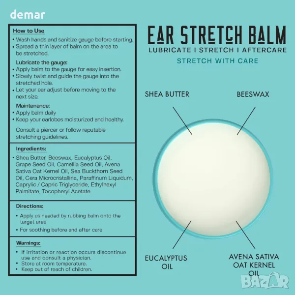 Този балсам за разтягане на ухото на растителна основа е предназначен за всички размери на ухото, включително двойни разширени тапи и рестартиращи затворени пиърсинг. Гладката формула помага за омазняване и защита на кожата по време на разтягане, като същевременно насърчава регенерацията на тъканите с естествени съставки като масло от ший, пчелен восък и евкалиптово масло. Създава невидима бариера, която предотвратява сухота и напукване, като същевременно успокоява раздразненията и овлажнява току-що опъната или пробита кожа. Идеален за последваща грижа, този балсам е по-малко разхвърляна алтернатива на маслата, осигурявайки лечебни ползи и подхранване.