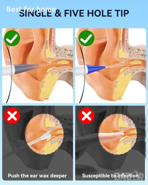 🌟ПЪЛНО НАПОЯВАНЕ НА УШИТЕ - Напълнете съда с хладка вода, поставете накрайника и напръскайте! Накрайникът с пет отвора с пет струи почиства целия ушен канал, а също и околностите на ухото, докато накрайникът с един отвор е по-концентриран и почистващият му ефект е по-силен. Можете да изберете според различните си нужди.⭐Уверете се, че използвате този акумулаторен уред за почистване на уши само с топла вода, тъй като стайната температура и студената вода могат да причинят замайване.