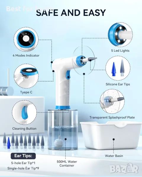🌟БЕЗОПАСЕН И ЕФЕКТИВЕН ИНСТРУМЕНТ ЗА ПРЕМАХВАНЕ НА УШНА КАЛРА - KAUGIC Ear Cleaner има меки силиконови накрайници, които се сменят след употреба. С 4 различни режима на почистване (7~24,5 PSI), този комплект за почистване на уши у дома може ефективно да премахне натрупаната ушна кал. Акумулаторната, захранвана с вода машина за почистване на уши включва 1 иригатор за уши, 1 съд за вода, 10 накрайника (накрайник с пет отвора x1, накрайник с един отвор x9) и USB кабел за зареждане.