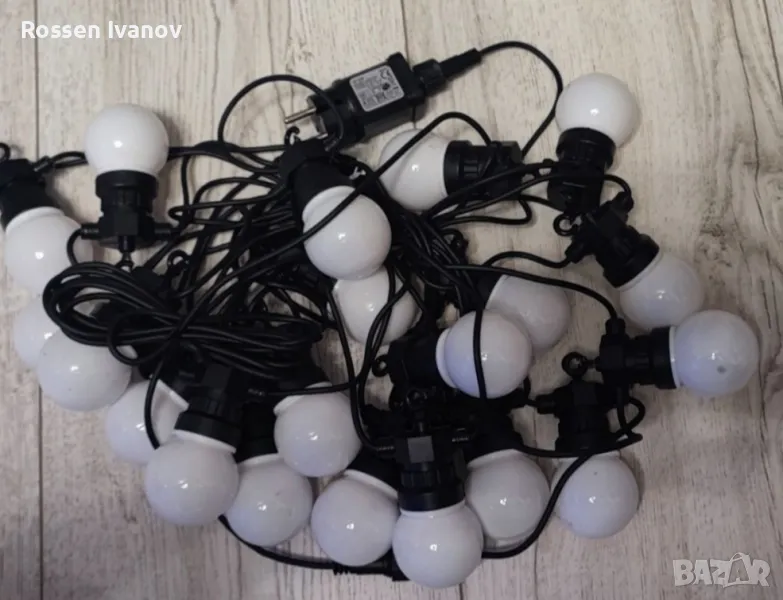 Градински/парти лампи герлянд. 20 кръгли млечни лампи. Топла бяла светлина. Обща дължина 13м. 8м с лампи и 5м кабел. Подходящи за изцяло външно използване.