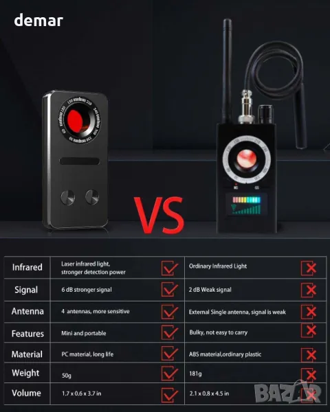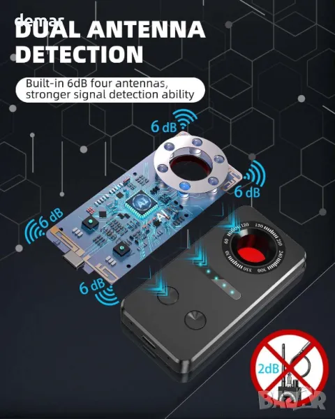 Този детектор за скрита камера разполага с четири 6dB антени за откриване на широк спектър от сигнали, включително 2G до 5G мобилни мрежи, безжични камери и грешки в SIM картата, с честотен диапазон на откриване от 1MHz до 6,5GHz. Оборудван с надградения чип A10Pro, той предлага подобрена точност, защита срещу смущения и дълъг живот на батерията. Шест инфрачервени лазерни светлини позволяват ефективно откриване както на кабелни, така и на безжични скрити камери, особено при условия на слаба светлина. Компактен и лек със само 48 грама, той е лесен за носене в чантата или джоба ви, с акумулаторна батерия от 300 mAh, която издържа до 5 часа непрекъсната употреба.