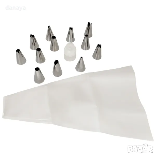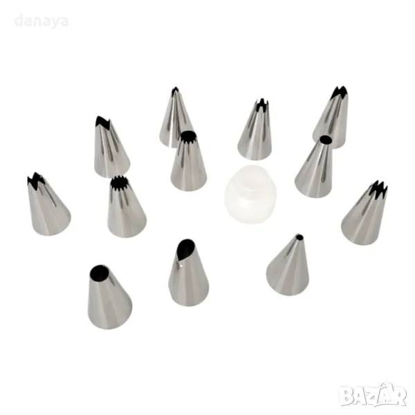 Комплектът включва 12 метални накрайника с различни форми за украса на торти, кексчета, бисквити и други сладкиши. Благодарение на удобния адаптор, можете да сменяте накрайниците лесно, без да изпразвате поша.