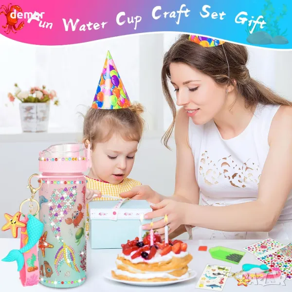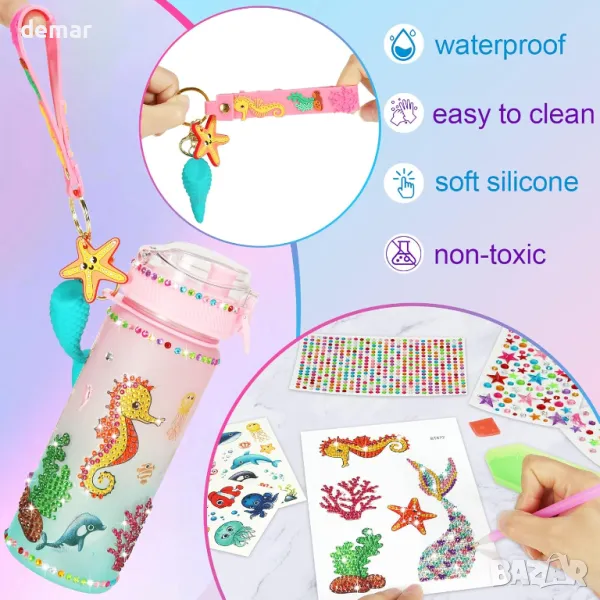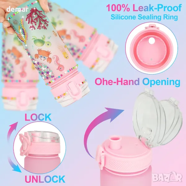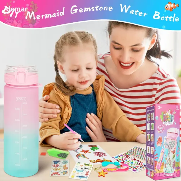 Този комплект бутилка за вода „направи си сам“ включва бутилка от 800 мл, лазерни стикери с мотиви на русалка, карикатура и искрящи диаманти, плюс цветен 3D ключодържател с русалка, който може да украси и раници. Проектиран да вдъхновява творчеството, той позволява на децата да персонализират своята бутилка за забавно изживяване „Направи си сам“. Игривият дизайн насърчава добрите навици за пиене, което прави хидратацията по-приятна в училище или на открито. Отличаващ се с изскачащ капак с едно щракване за лесно използване с една ръка, той има сигурно заключване и силиконов пръстен за 360-градусова защита от течове. Перфектен подарък за момичета, обичащи русалки на възраст 4-12 години, идеален за рождени дни и празници.