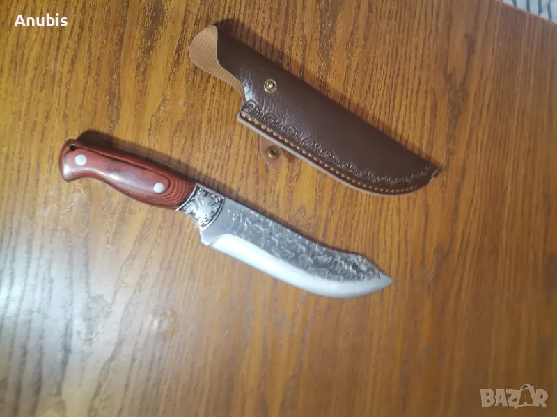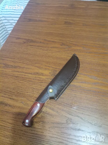 Голям нож тип сатър от нераждаваема стомана с кожен калъф и дървена дръжка
