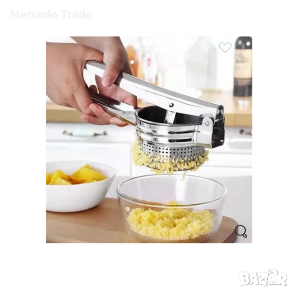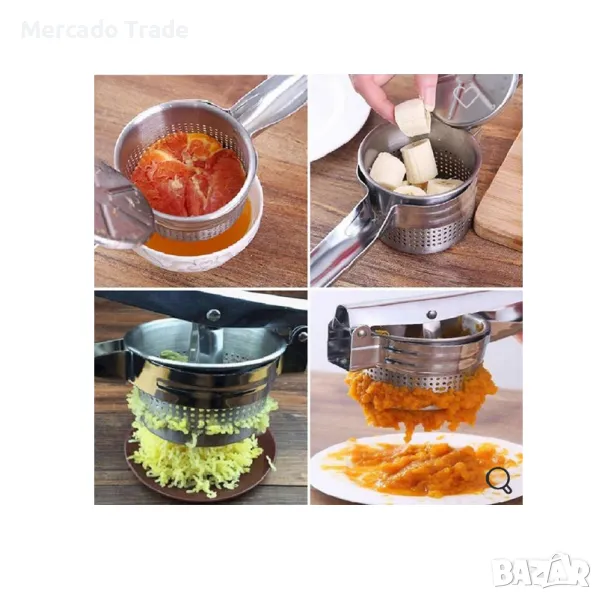 Преса за картофи, зеленчуци или плодове Mercado Trade.Съдържа подвижен перфориран контейнер за лесно събиране на съдържанието и почистване.Пасирайте сварени картофи за перфектно пюре, зеленчуци за супи или домати за паста.Това е основен инструмент в кухнята. Материал на продукта: Метал