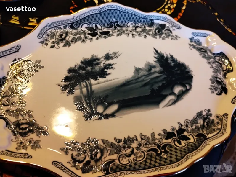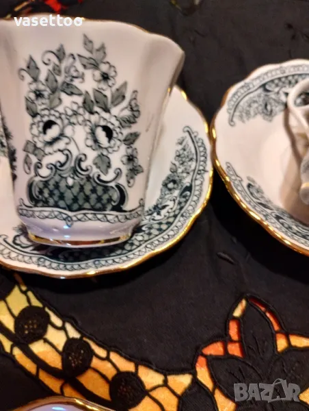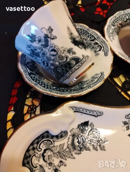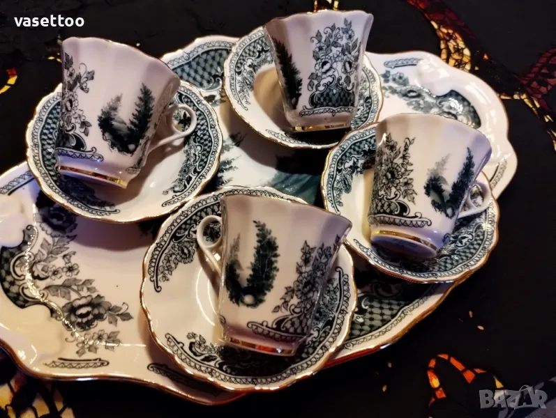 Невероятно красив комплект за кафе от четири чашки 7/6см. около 120 мл.,четири подложни чиниики 2.5/11 см. и много красив поднос с релефна декорация 36/23 см. Моля, разгледайте и другите ми обяви, има много красиви неща!