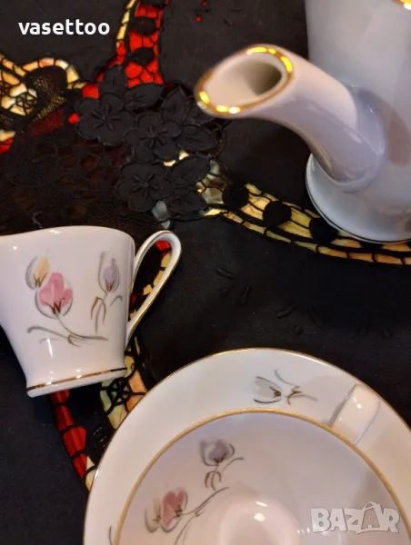 Неупотребяван сервиз за кафе от много качествен фин порцелан от шест чашки 4.5/7.5см. 100 мл., шест чиниики 11.5 см., кафеник, каничка и захарница. Моля, разгледайте и другите ми обяви, има много красиви неща!