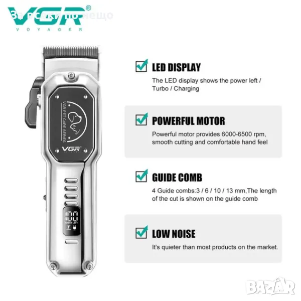 подстригване на домашни любимци с VGR V-201 Professional Pet Clipper. Проектирана за професионална и домашна употреба, тази първокласна машинка за подстригване на домашни любимци разполага с усъвършенствана технология и висококачествени компоненти, за да осигури гладко и ефективно подстригване.