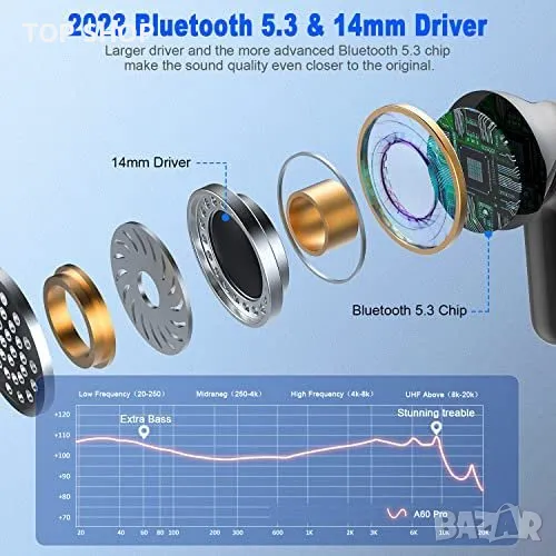 Тези безжични слушалки използват уникален стерео дизайн и 14-милиметрови композитни мембрани, за да осигурят мощен звук с 43% повече баси. Те поддържат висококачествено декодиране на аудио AAC, което осигурява професионално звуково изживяване. Слушалките се предлагат с три различни по големина накрайника за уши, които осигуряват сигурно прилягане и намаляват вероятността да паднат.