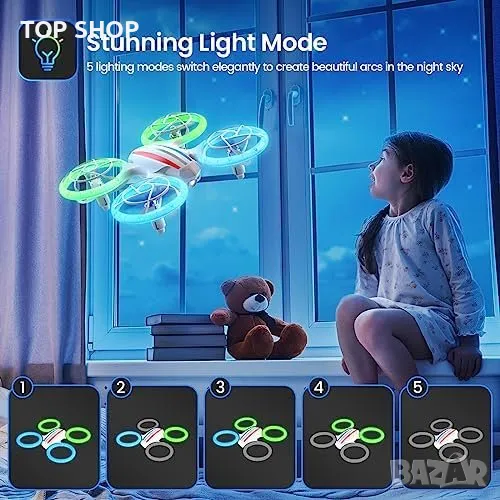 Ярки сини и зелени LED светлини в четири защитни рамки за ярко изживяване при полет с пет различни режима на показване.