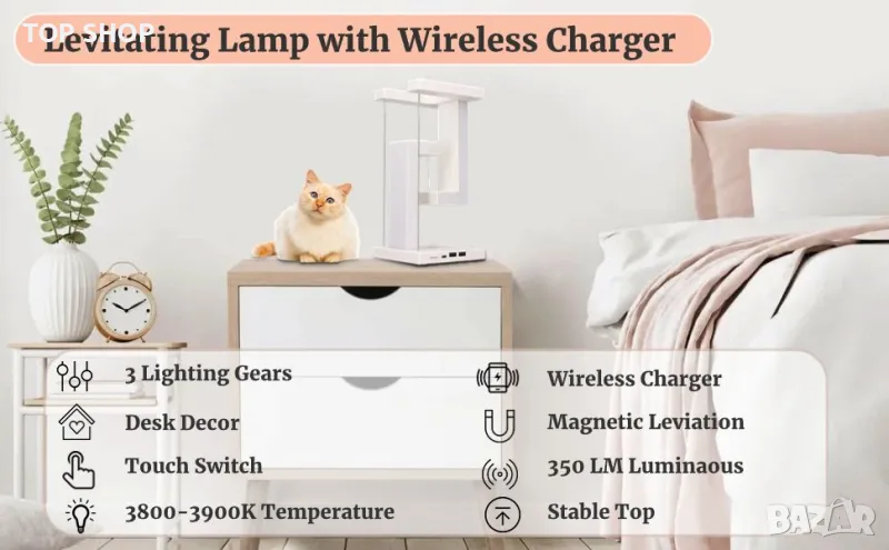 【Безжично зарядно устройство】 Левитиращата лампа използва дизайн за безжично зареждане за мобилни телефони, така че не е нужно да търсите кабели за зареждане, което осигурява повече удобство.
