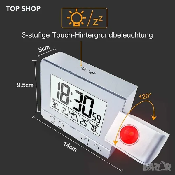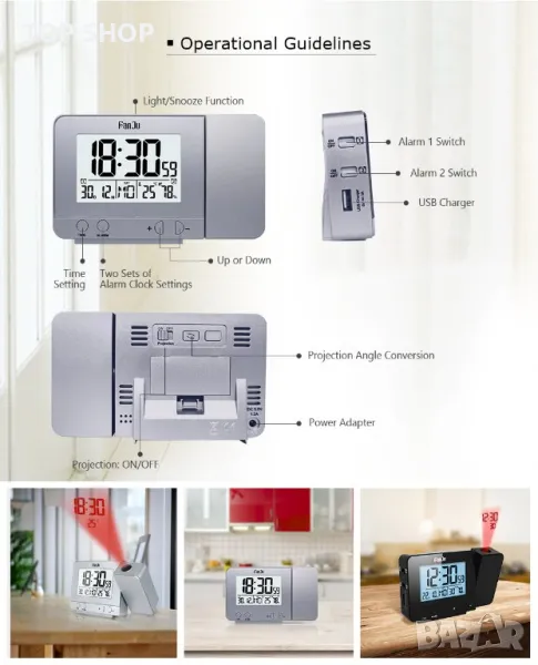Прожекционен часовник с термометър, влагомер, USB слот,календар и будилник Прожекционен будилник, голям шрифт 180 Въртящ се прожекционен часовник
