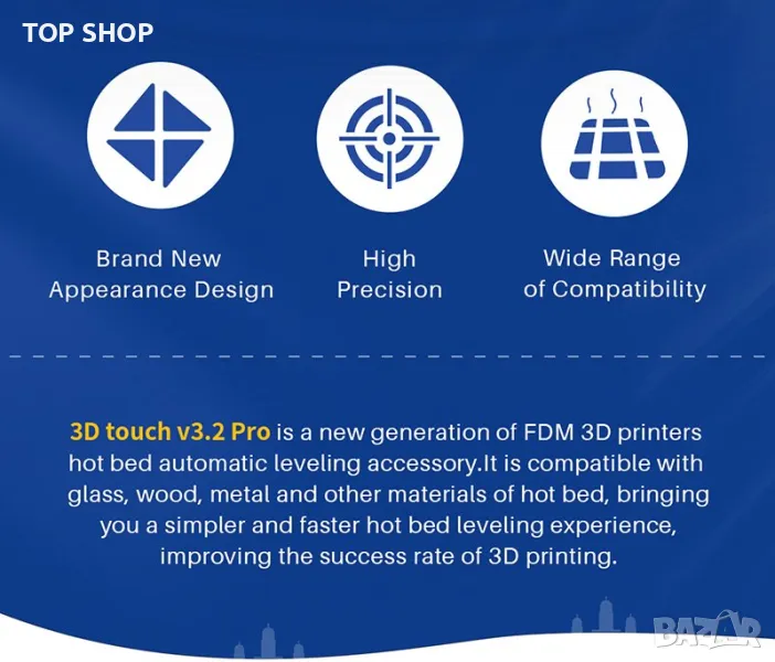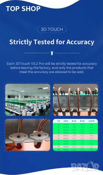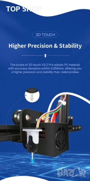 3D Touch V3.2 Pro е аксесоарът за автоматично нивелиране от ново поколение на FDM 3D принтер. Създаден по най-новата технология, той може да измерва точно наклона на парника. Може да се използва за парници, изработени от стъкло, дърво, метал и т.н. Потребителите вече не се нуждаят от ръчно нивелиране на парниците, което предоставя на потребителите по-просто и по-бързо изживяване при нивелиране на горещи легла и подобрява степента на успеваемост и точността на печат.