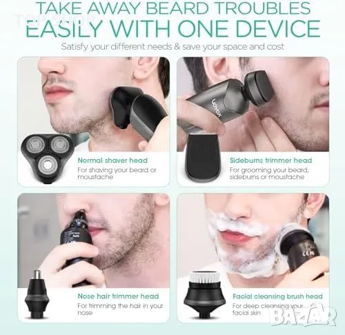 4-в-1 ротационна самобръсначка: Четири сменяеми глави за бръснене на брада, подрязване на бакенбарди и носни косми, и почистване на лице.