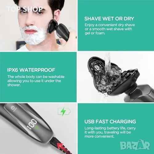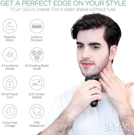 Мокро и сухо бръснене: Използване на сухо за удобство или мокро с пяна за комфорт, дори под душа. Водоустойчива (IPX6) и лесна за почистване.