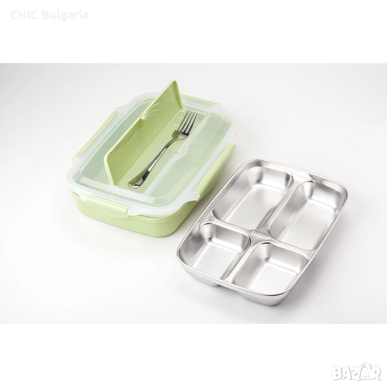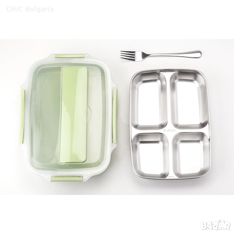 Непропускливата кутия за обяд е перфектното решение за безопасното съхранение и организация на вашата храна. Кутията за храна е изработена от висококачествена неръждаема стомана с четири отделения за здравословна и балансирана ежедневна храна. Можете да затоплите храната си, като излеете вряла вода под подвижните стоманени отделения. Тя е перфектна за ученици, студенти и хора в движение. Благодарение на доброто си уплътнение с катарама, можете съвсем спокойно да си я носите в раницата или чантата.