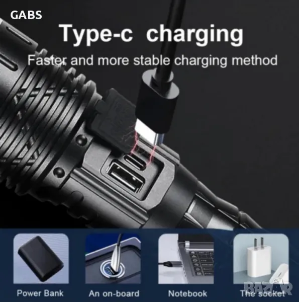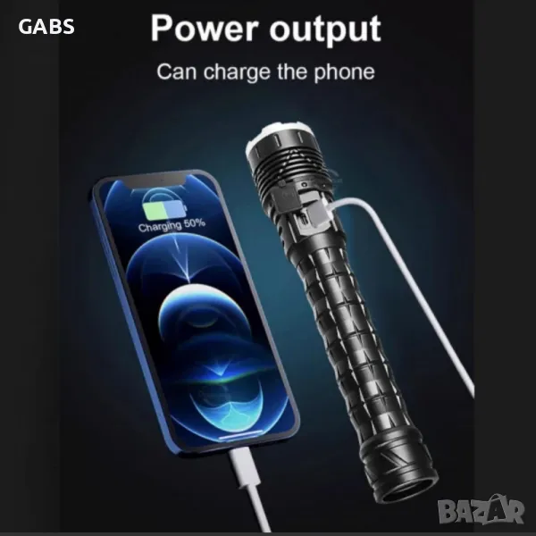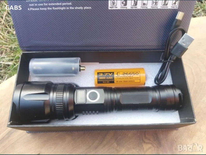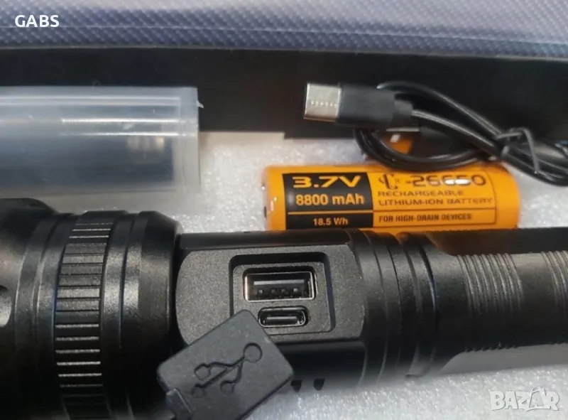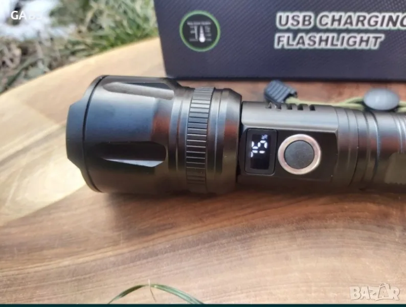 Мощен LED Flach Light фенер с дисплей за заряда на батерията.Дължина на лъча до 1000м и дълъг живот на диода до 10000 ч.Снабден с телескопичен ZOOM и 5 режима на работа - силен, стандартен, икономичен, блиц и SOS сигнал.При задържане на бутона светлината се усилва и намалява плавно.Фенера се предлага с Li-ion батерия 26 650, 8800mAh, 3,7V.В комплекта има и USB кабел за зареждане,като има и изход за зареждане на телефон.