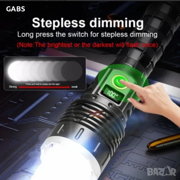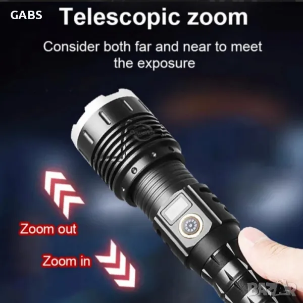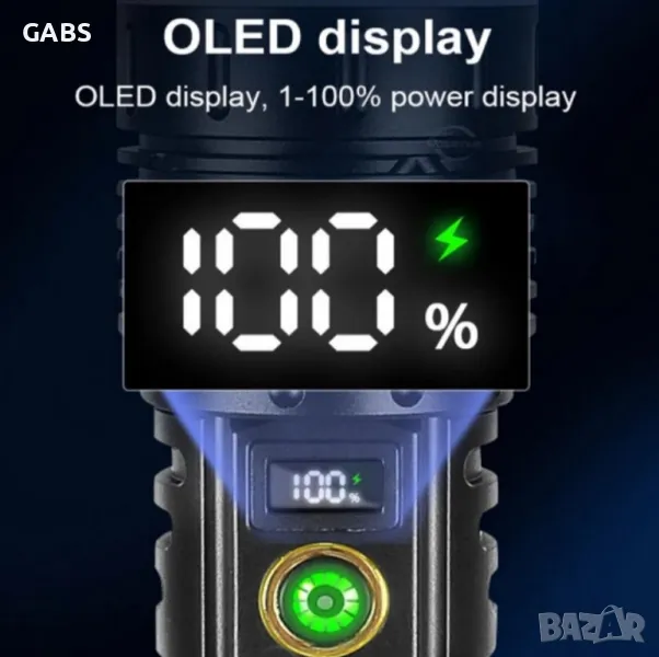 Мощен LED Flach Light фенер с дисплей за заряда на батерията.Дължина на лъча до 1000м и дълъг живот на диода до 10000 ч.Снабден с телескопичен ZOOM и 5 режима на работа - силен, стандартен, икономичен, блиц и SOS сигнал.При задържане на бутона светлината се намалява и усилва плавно.Фенера се предлага с две Li-ion батерии 26 650, 8800mAh, 3,7V.В комплекта има и USB кабел за зареждане,като има и изход за зареждане на телефон.