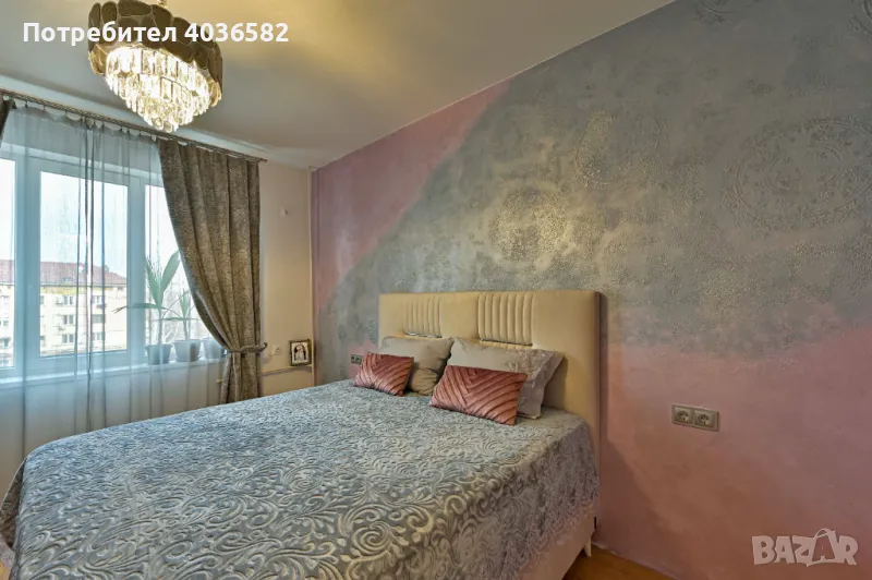 Основна спалня - Луксозна визия с декоративни мазилки, съчетаващи розови и сребристи тонове, комфортно легло с тапицирано табло и изискано осветление с кристален полилей.
