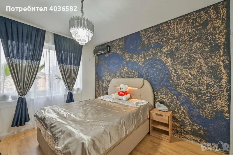 Втора спалня - Уютна и стилна, с уникален стенен дизайн в тъмно синьо и златисто, удобна мебелировка и красиво осветление.