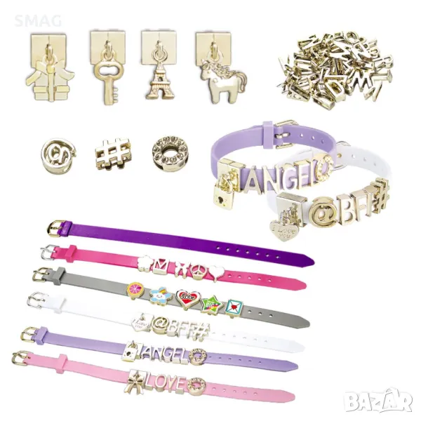 Каишки и мъниста, за да създадете свои собствени гривни според собствения си вкус и въображение. Направете 6 гривни с талисмани, висулки и букви в различни цветове и дизайни и ги споделете с приятелите си. Добавете блясък към визията си с модерни мъниста!