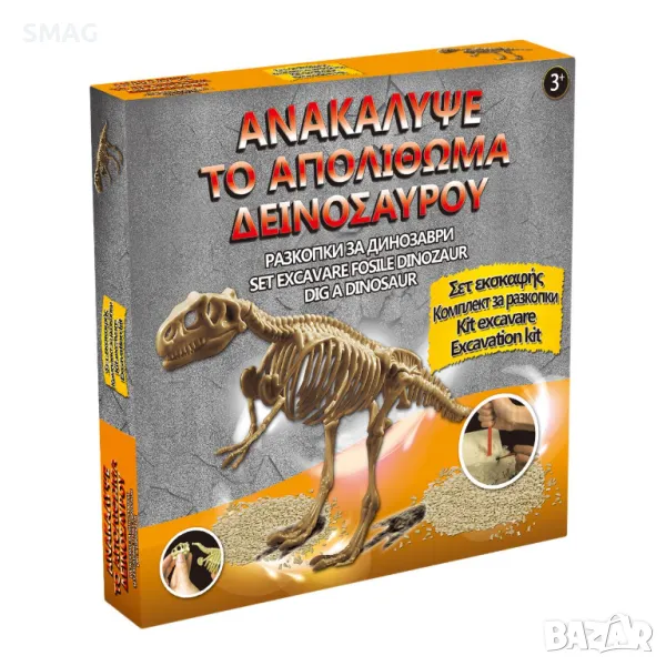 Играчка за откриване на вкаменелости от динозавър с комплект за разкопки, който включва гипсова пръчка, инструмент за изкопаване и четка за рисуване. Можете да сглобите частите на динозавъра, които откриете, и да видите вкаменелостта завършена.