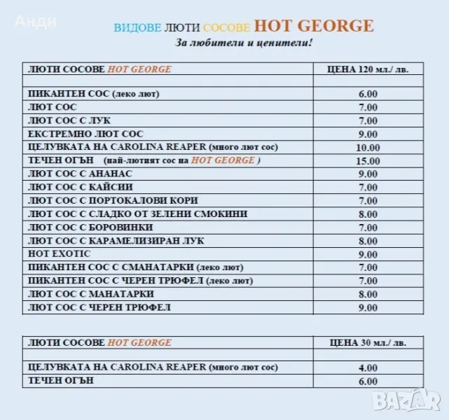 Надграждането на лютивостта на класическия сос HOT GEORGE става с допълнително количество от лютите чушки в степени СИЛЕН, ЕХТРЕМЕН, „ЦЕЛУВКАТА НА CAROLINA REAPER”.