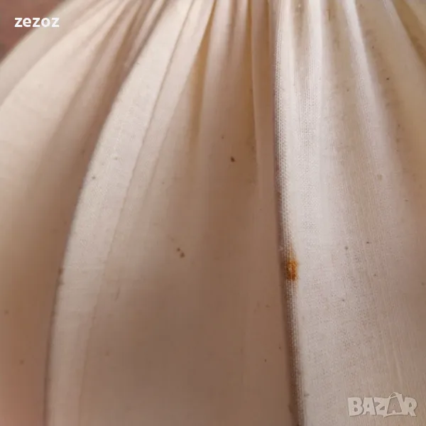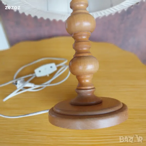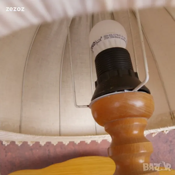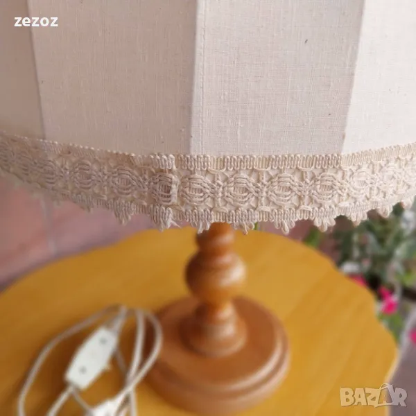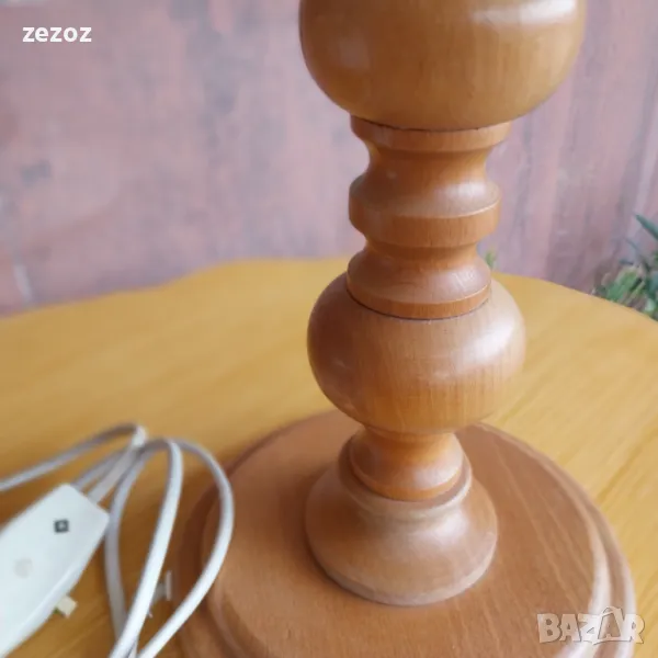 Ретро настолна лампа с дървен ствол и платнен плафон.Леки забележки по шапката.Работи.