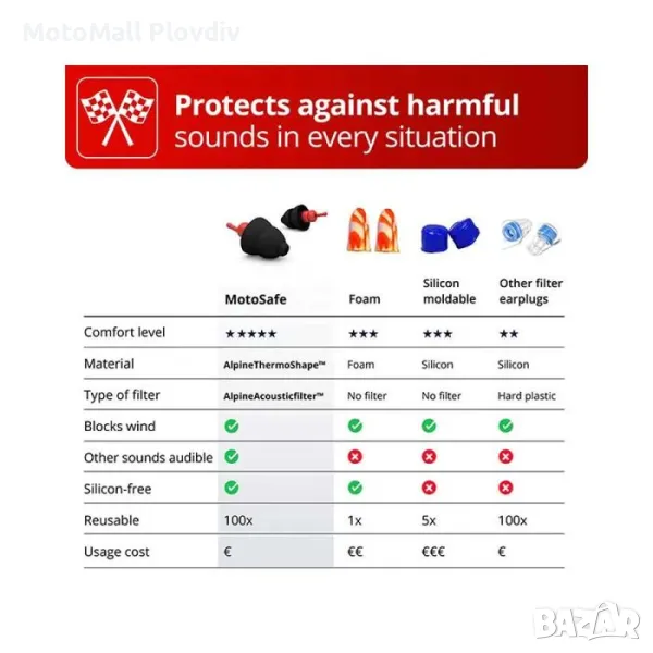 Например, на писта или с отворена каска ще са ви необходими Alpine MotoSafe Race, които са с по-висока степен за заглушаване.