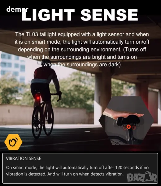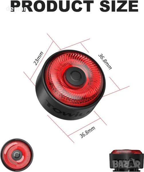 Задната светлина за велосипед TOWILD TL03 включва спирачен сензор, който автоматично светва за 1 секунда при спиране, за да предупреди следващите водачи. Той предлага опция за включване или изключване на сензора за спирачки с просто 3-секундно натискане. Оборудван със сензор за вибрации, светлината автоматично се изключва след 2 минути без движение и се включва отново с вибрация. Светлинният сензор гарантира, че светлината се изключва на дневна светлина и се включва в тъмна среда. С USB-C зареждане издържа до 36 часа при пълно зареждане и е IPX6 водоустойчив. Светлината може лесно да се монтира на седлото или колчето на седалката с включени О-пръстени и кабелни връзки.