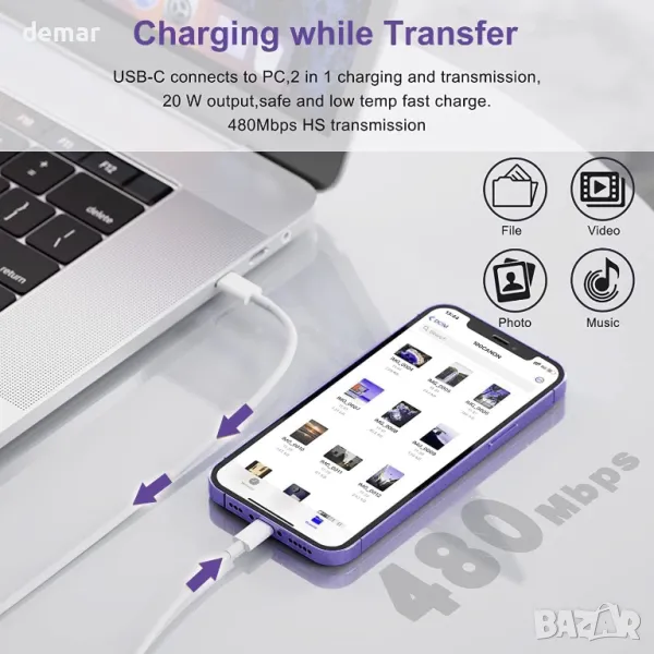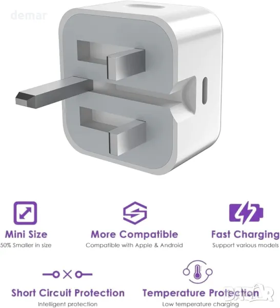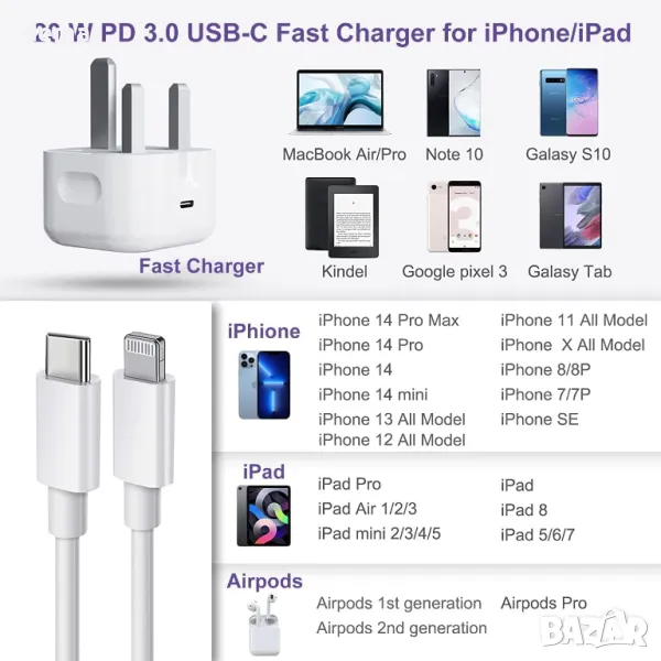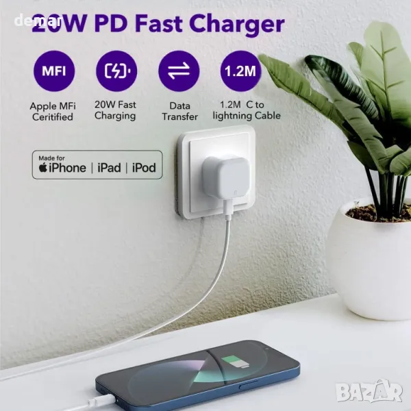 Това 20W бързо зарядно устройство за iPhone доставя до 50% заряд само за 30 минути, предлагайки 3 пъти по-бързо зареждане от стандартните 5W адаптери. Съвместим е с различни модели iPhone (iPhone 14, 13, 12, 11 и други) и iPad. USB-C зарядното разполага с вградена система за мулти защита, гарантираща безопасност от пренапрежение, прегряване и презареждане, докато светкавичният кабел има интелигентен чип за оптимално зареждане. Неговият компактен и преносим дизайн е издръжлив, издържащ на 15 000+ огъвания. Включва един 20W USB-C заряден блок и един 1M кабел за зареждане на iPhone.