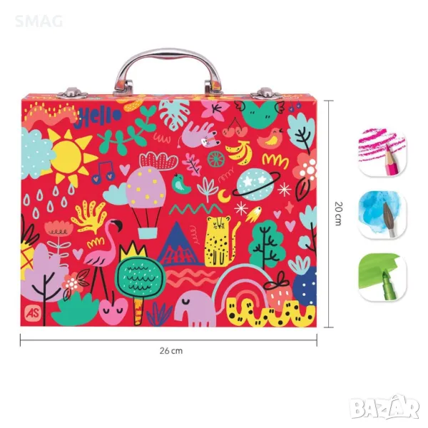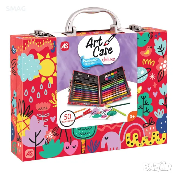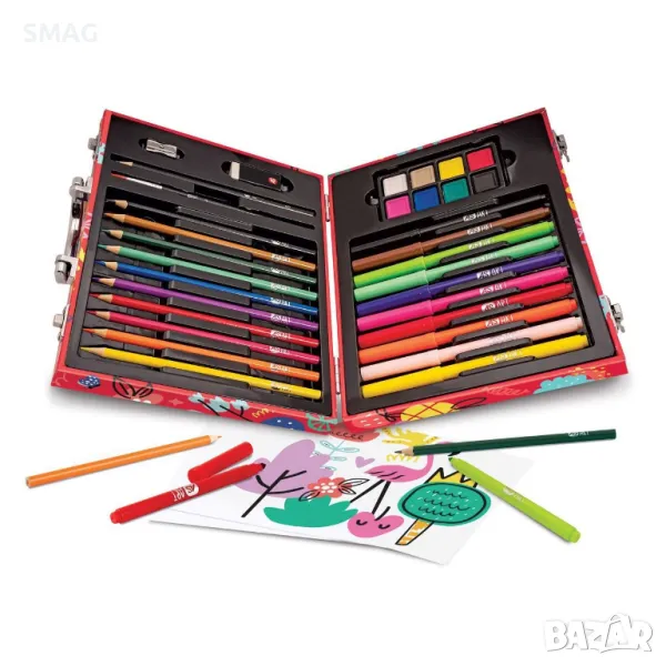 Колкото и цветове да имате, те никога не са достатъчни за вашата картина! В комплекта ще намерите 50 аксесоара, за да рисувате любимите си рисунки и да научите различни техники. И всичко това в калъф с дръжка, който можете да носите навсякъде със себе си! Включва: 10 миещи се маркера, 10 пастели, 8 водни бои, 18 листа за рисуване, молив за рисуване, четка, гумичка и острилка.
