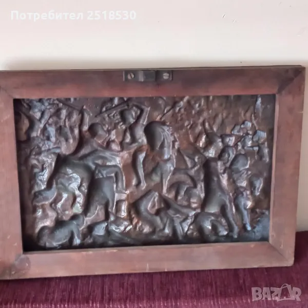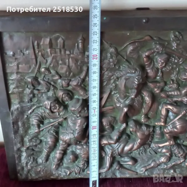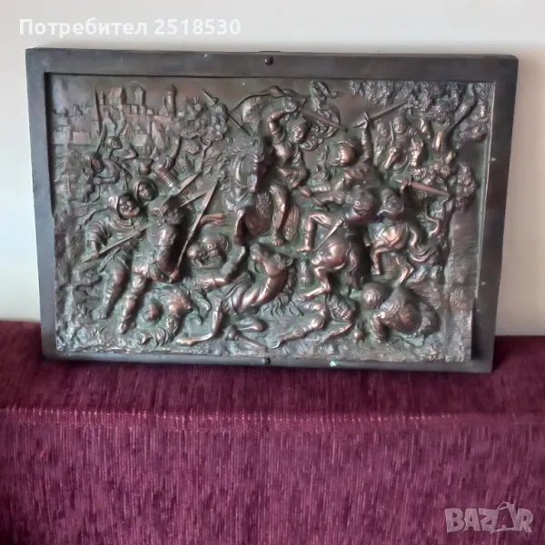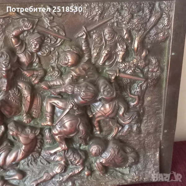 Стара релефна метална картина масивна отливка около 4-5 кг.Картината пресъздава битка от средновековието на фона на старинен град.Много подходяща за подарък и декорация.