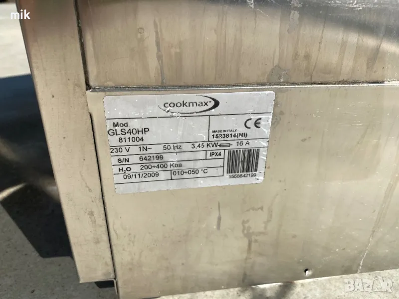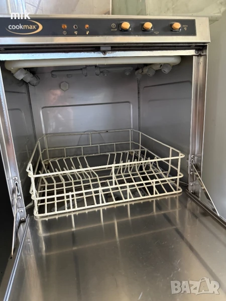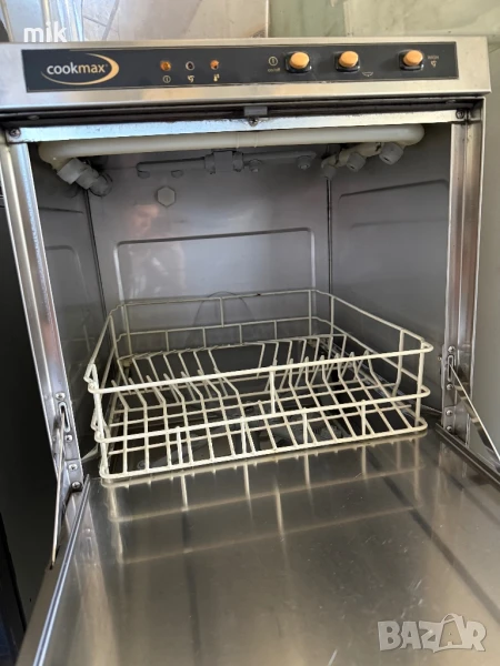 Професионална чашомиялна машина. Марка - CooKMax. Напълно работеща. Монофазна. Размери 70в-44ш-54д. Оборудвана С маркучи за препарат, както и за мръсна и чиста вода. Бърз цикъл на миене - около 2 минути.