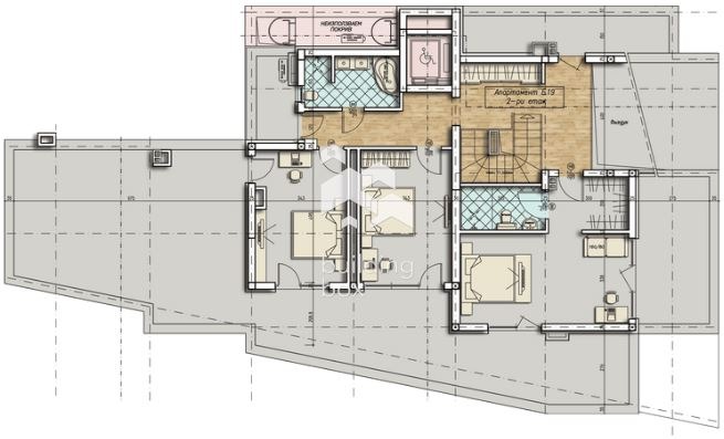 8-ми етаж: три спални, две бани с тоалетна, дрешник и просторна тераса.Етажната височина е 3,10м.