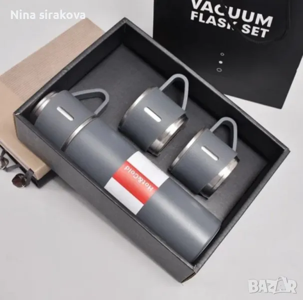 Подаръчен комплект термос с 3 чаши, зелен, розов, сив → Обява 49258979