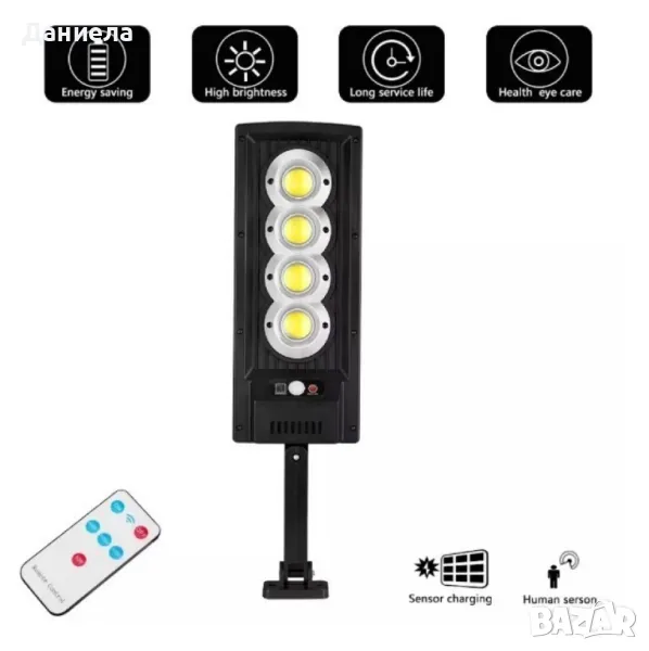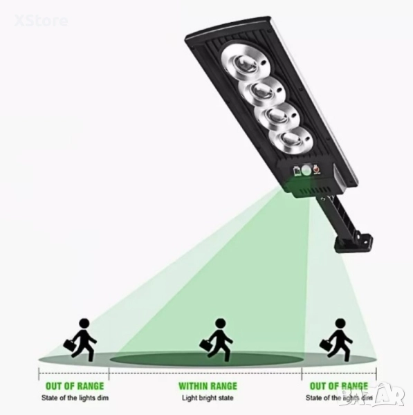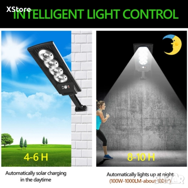 Работи само през нощта. През деня лампата не свети.Автоматичен старт. Датчик за движение. Когато някой се появи в зоната, на 3-5 м, светлината ще се включи автоматично.3 светлинни режима:Режим на охранителна светлина (при засичане на движение през нощта, сензорът автоматично включва и изключва светлината)Режим на светлина за събуждане (светлината с нисък интензитет остава включена цяла нощ, а когато сензорът засече движение, интензитетът се увеличава до максимум)Постоянен режим, активиран през цялата нощ (светлината остава включена с максимален интензитет през цялата нощ)Лампата се нуждае от 6 часа зареждане на слънчева светлина през деня и работи 8 часа през нощта. Зареждането на слънчевия панел зависи от продължителността на светене и метеорологичните условия.