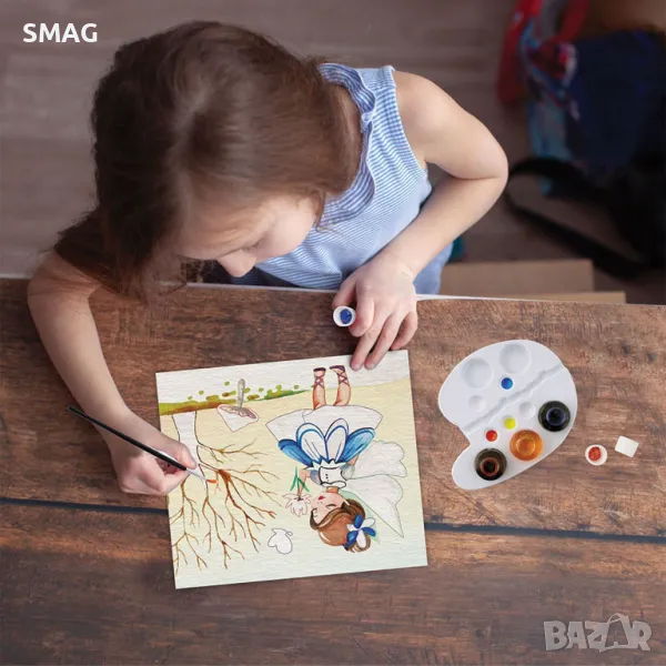 Произведението върху предварително отпечатана акварелна хартия оживява, докато го оцветявате. Пакетът съдържа 4 предварително отпечатани полуцветни произведения на изкуството, 3 акварела, четка, палитра, както и подробно илюстрирано ръководство за изучаване на техниката на рисуване с акварел.