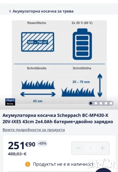 Акумулаторна косачка Scheppach, снимка 1 - Градинска техника - 49261826 Акумулаторна косачка Scheppach, снимка 2 - Градинска техника - 49261826 Акумулаторна косачка Scheppach, снимка 3 - Градинска техника - 49261826 Акумулаторна косачка Scheppach, снимка 4 - Градинска техника - 49261826 Акумулаторна косачка Scheppach, снимка 5 - Градинска техника - 49261826 Акумулаторна косачка Scheppach, снимка 6 - Градинска техника - 49261826 Акумулаторна косачка Scheppach, снимка 7 - Градинска техника - 49261826 1/7