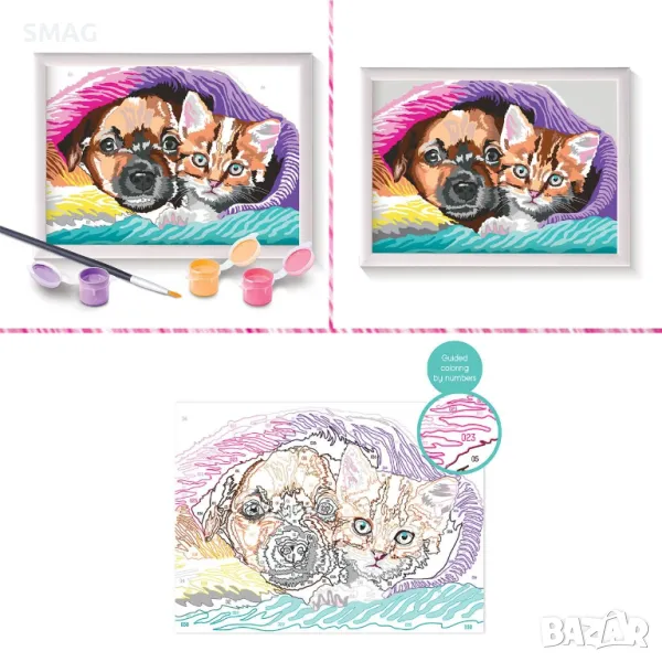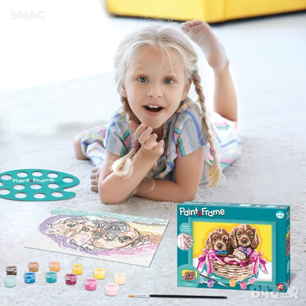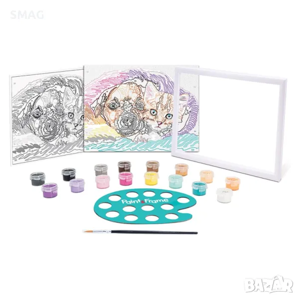Новата серия Paint & Frame Painting е идеалният избор за истински произведения на изкуството! Украсете стаята си със собствено произведение на изкуството! Рисуване по номера с готови акрилни бои. С Paint & Frame, която се основава на техниката за рисуване цвят по номер, вие се научавате да оцветявате в детайли всички точки на вашата предварително отпечатана карта, като по този начин подобрявате своя артистичен талант и развивате фините си двигателни умения. Крайният резултат ще създаде чувство на радост, гордост и удовлетворение! Почувствайте гордост от своя шедьовър, поставете го в рамката му и украсете стаята си с него. Комплектът включва: предварително отпечатана пощенска картичка с дизайн на куче, 16 акрилни бои в пластмасови бурканчета, пластмасова рамка, четка и тема: Сладко приятелство.